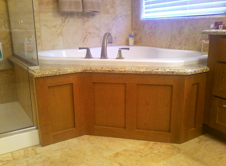 We created a custom wood panel for this corner tub to match the cabinets. If you can dream it, we can build it!