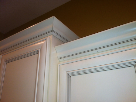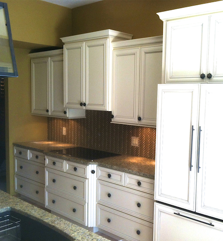 White cabinets, with glass tile back splash and olive granite countertops. Check out the detail on the cabinets. More