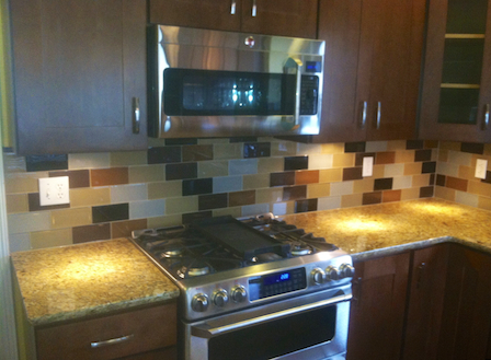 With lots of work and storage space, this kitchen features glass tile back splash. More
